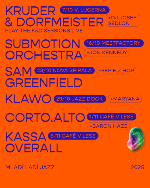 Mladí ladí jazz brings this autumn a bold and diverse lineup that blurs the boundaries between jazz, electronic music, soul, and hip-hop. Headliners include Austrian downtempo legends Kruder & Dorfmeister, the genre-defying British group Submotion Orchestra, Grammy-nominated American drummer and rapper Kassa Overall, and rising Polish fusion band Klawo. From the atmospheric beats of corto.alto to the New York energy of saxophonist Sam Greenfield, the festival showcases fresh sounds from across Europe and beyond. Concerts will take place at iconic Prague venues from October 7 to November 6. Full program and tickets available at www.mladiladijazz.cz.