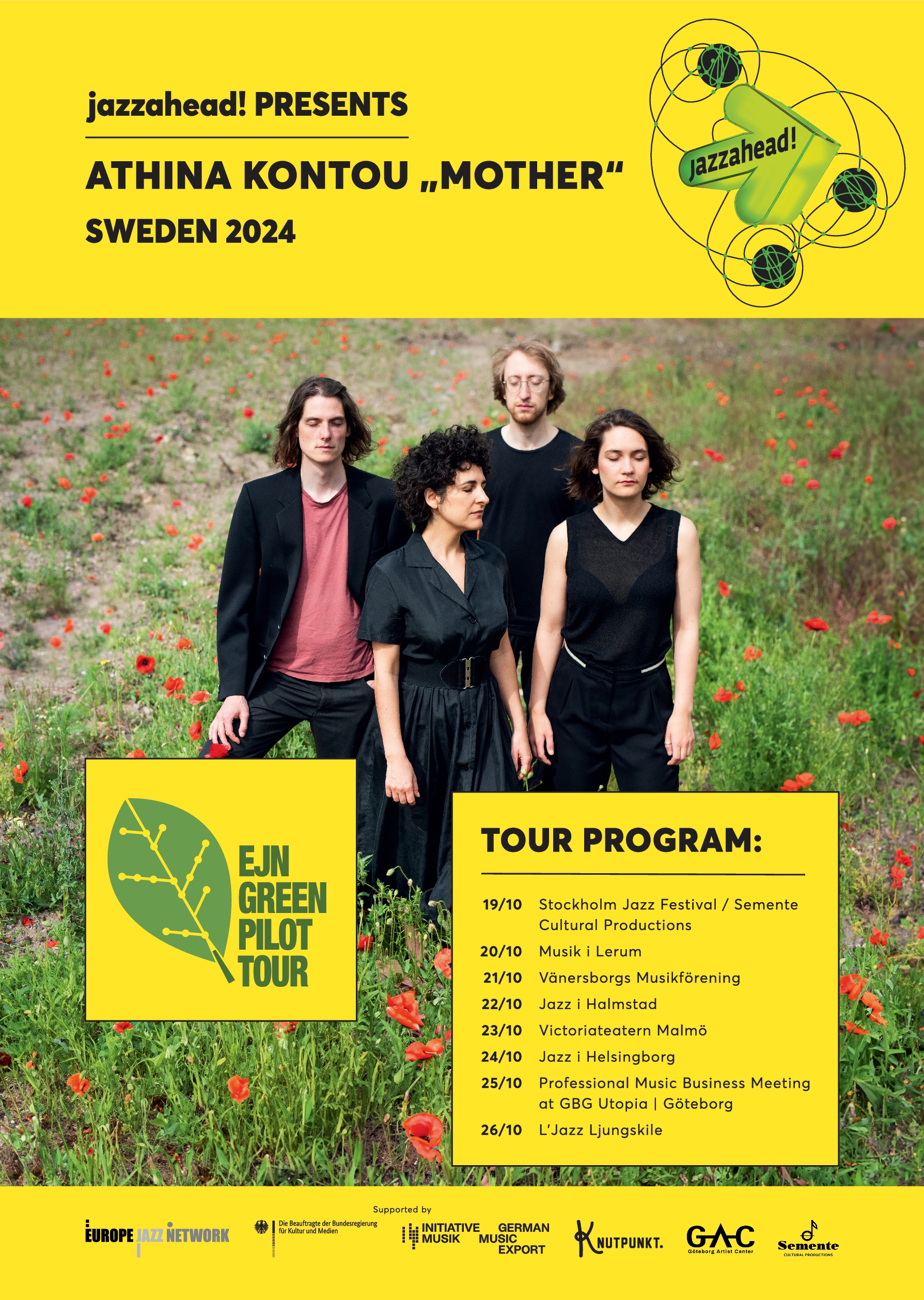Organised by jazzahead! in collaboration with Knutpunkt and Semente Cultural Productions, the "Mother" Green Pilot Tour was a landmark initiative that showcased sustainable touring practices while fostering cultural exchange between Germany and Sweden. Led by bandleader Athina Kontou, this tour marked the band’s first international tour and included eight concerts, a workshop, and professional networking events.