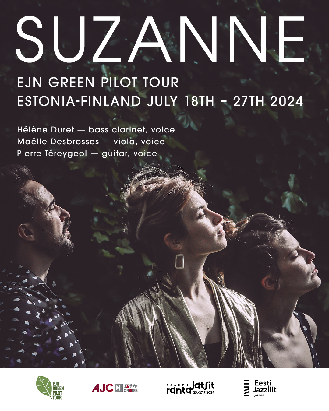 Suzanne, a French trio comprising viola player Maëlle Desbrosses, bass clarinettist Hélène Duret, and guitarist Pierre Tereygeol, embarked on a twelve-day Green Pilot Tour through Estonia and Finland from 17 to 28 July 2024. Dedicated to exploring folk songs of the new century, Suzanne embraced the principles of Slow Touring, minimising their environmental impact while delivering eight captivating performances. This tour was co-produced by Helsinki-based agency Vapaat äänet and the Raahe Jazz on the Beach festival, in partnership with Jazz Estonia, with support from EJN and AJC.