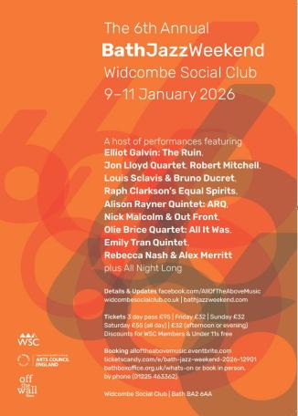 Bath Jazz Weekend is run on a co-operative basis, with musicians and crew all agreeing to take an equal share of the proceeds after necessary expenses. The 2026 Weekend offers 10 performances and will include a jazz-related film and photographic exhibition. Among the 37 musicians featured are British pianists and composers Elliot Galvin, Robert Mitchell and Alexander Hawkins and the French duo of Louis Sclavis and Bruno Ducret.