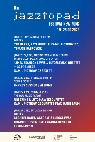 Performances include James Brandon Lewis and the Lutosławski Quartet’s US Premiere of “These are soulful days”; premiere of Kamil Piotrowicz Sextet’s new album “Weird Heaven”; members of the Sextet with appearances by Tim Berne, Kate Gentile, and Jamie Baum; and the Lutosławski Quartet in concerts with Uri Caine and Michael Bates’ Acrobat.