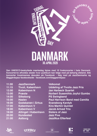 11:00: Welcome from JazzDanmark 11:15: The Tivoli Ensemble plays with the winner of Tivoli Jazz Prize, recieved by guitarist Pelle von Bülow 12:00 Jan Harbeck Quartet from Copenhagen 13:00 Norbert Susemihl's Joyful Gumbo from Præstø 14:00 PS Swingband from Silkeborg 15:00 Paul Harrison Band from Haslev 16:00 Svaneborg Kardyb from Aarhus 17:00 Kira Martini Quintet from Copenhagen 18:00 Jacob Artved Trio from Copenhagen 19:00 Sisters of Jazz from Altinget from Copenhagen 20:00 Jazz Five from Hundested 21:00 Afterparty with JAZZ9TUS in Aalborg!