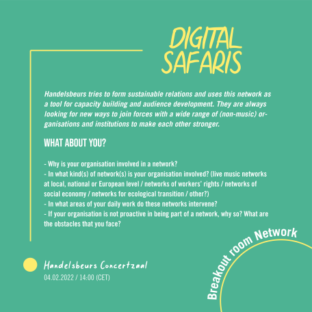 This fourth episode will be a bit different as everyone is invited to actively participate, to propose ideas, discuss and ask questions. This Safari focuses on exchanging ideas and good practices. After a short presentation of Handelsbeurs’ practices, you will be divided in three groups.