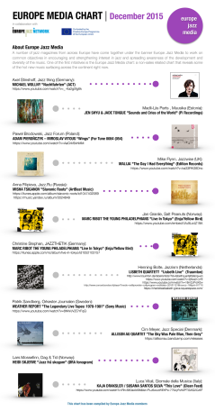 A number of jazz magazines and websites from across Europe have come together under the banner Europe Jazz Media to work on common objectives in encouraging and strengthening interest in jazz and spreading awareness of the development and diversity of the music. One of the first initiatives is the Europe Jazz Media chart: a non-sales related chart that reveals some of the hot new music surfacing across the continent right now.
