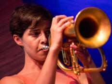 Finding ground in the cross-section of re-invented traditional jazz idioms and innovation intrinsic to jazz since the 1970s, the Portuguese-Canadian trio Lama performed soon after the concert by Kaja Draksler. Susana Santos Silva’s charismatic trumpet playing was characterised by absence of conventional jazz patterns, while drummer Greg Smith and double bass player Gonçalo Almeida journeyed between recognizable patterns and contemporary departures into atonality and electroacoustic soundscapes. The line-up mostly played compositions from their acclaimed album Oneiros, dedicated to dreamscape paradoxes, which the harmonious threesome transliterated into a multilayered eclectic music that ranged from an imitation of a battered-up LP to outer-space escapades on the electronica and double bass.