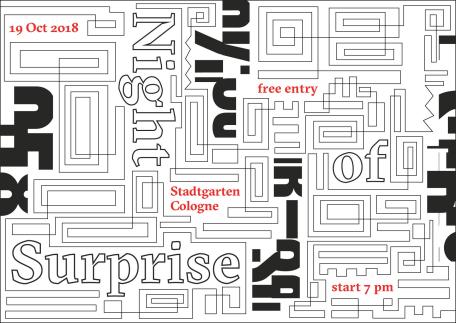 "Night of Surprise" is a free-entry, highly open-minded music one-nighter offering a wild mix of non-mainstream music. The annual event has quickly established itself as Cologne ́s most progressive music festival: In its first four editions it featured musicians like contem- porary soprano Donatienne Michel-Dansac, Peter Evans ́ Pulverize the Sound, Zs, Felix Ku- bin, Baby Dee, synth-extremist Thomas Ankersmit, Sofia Jernberg and Hail Mergia as well as edgy club acts like Hieroglyphic Being, DJ Nigga Fox, Rabih Beaini or Mutamassik with little known musicians and bands from Cologne or different subcultures. It brought out some 1000+ people last year. Here is some footage. Video Night of Surprise 2015
