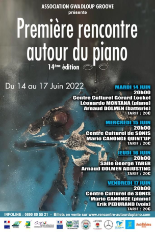 The 14 edition of the "Premiére rencontre autour du piano" in the caribbean island of Guadeloupe will take place between 14 and 17 June 2022, with concerts by Leonardo Montana & Arnaud Dolmen, Mario Canonge & Michel Zenino Quintet, Arnaud Dolmen “Adjusting” Project, Mario Canonge & Erik Pédurand.