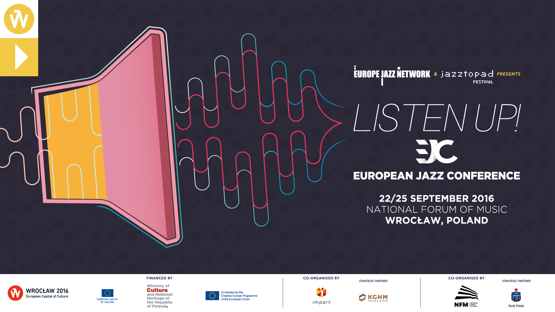 The European Jazz Conference 2016 is co-organised by Europe Jazz Network (EJN), the National Forum of Musicand Jazztopad Festival, takes place in the framework of the European Capital of Culture 2016 programme and it is supported by the Ministry of Culture and National Heritage of Poland and by the Creative Europe programme of the European Union.
