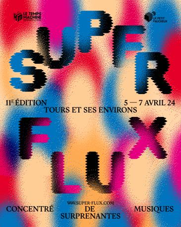 Le Temps Machine and Le Petit Faucheux present the 11th edition of the Super Flux festival, a concentrate of surprising music, in partnership with the TALM Tours School of Art and Design. From April 5th to 7th, 2024 in Tours and its surroundings.