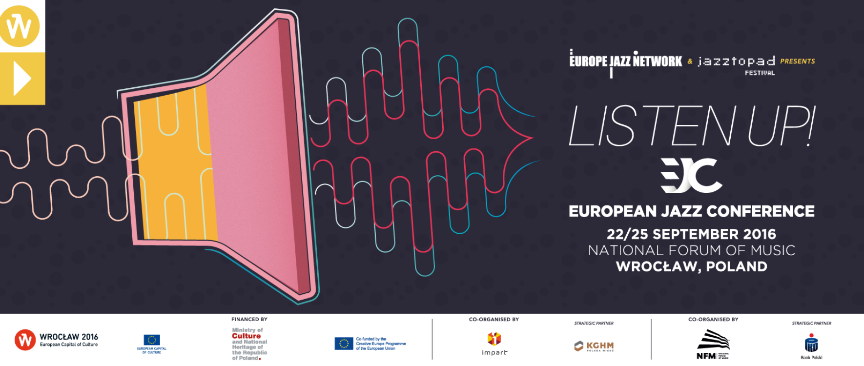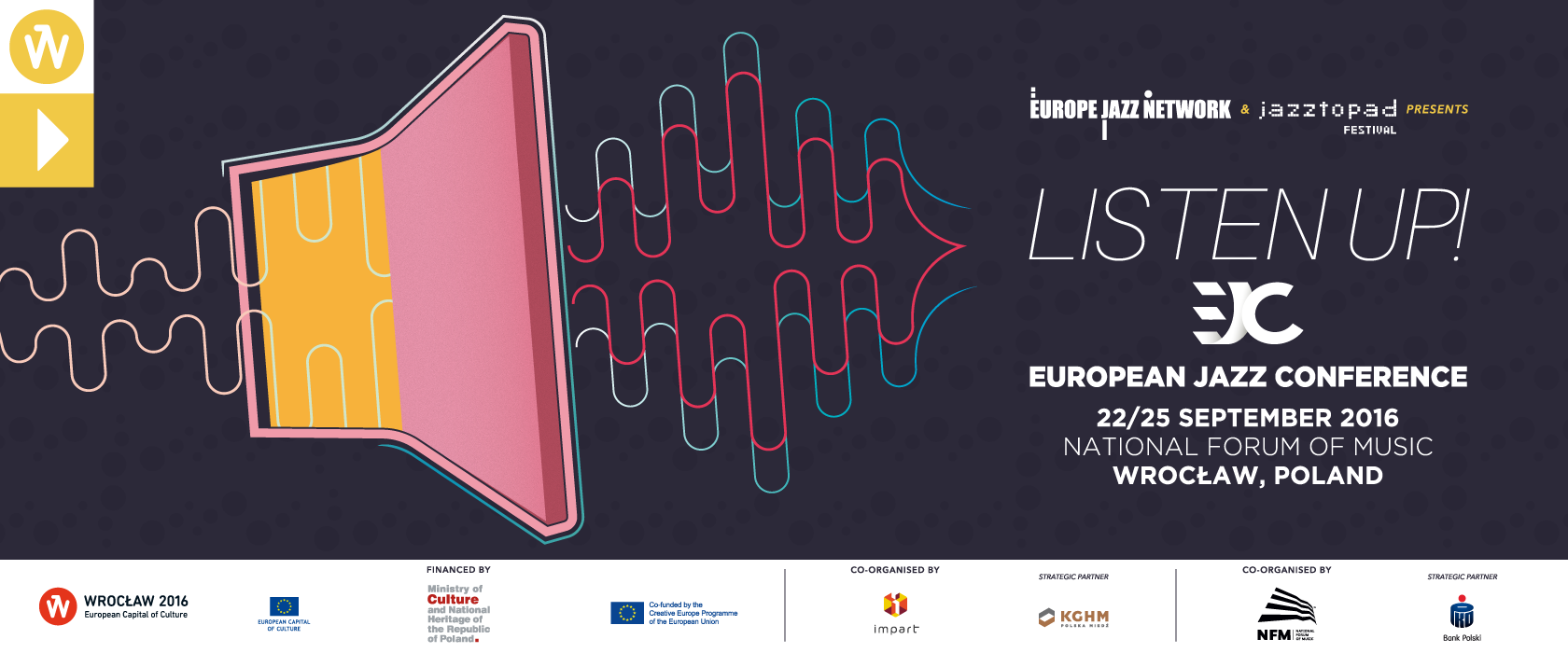 The European Jazz Conference 2016 was co-organised by Europe Jazz Network (EJN), the National Forum of Music and Jazztopad Festival, took place in the framework of the European Capital of Culture 2016 programme and it was supported by the Ministry of Culture and National Heritage of Poland and by the Creative Europe programme of the European Union.