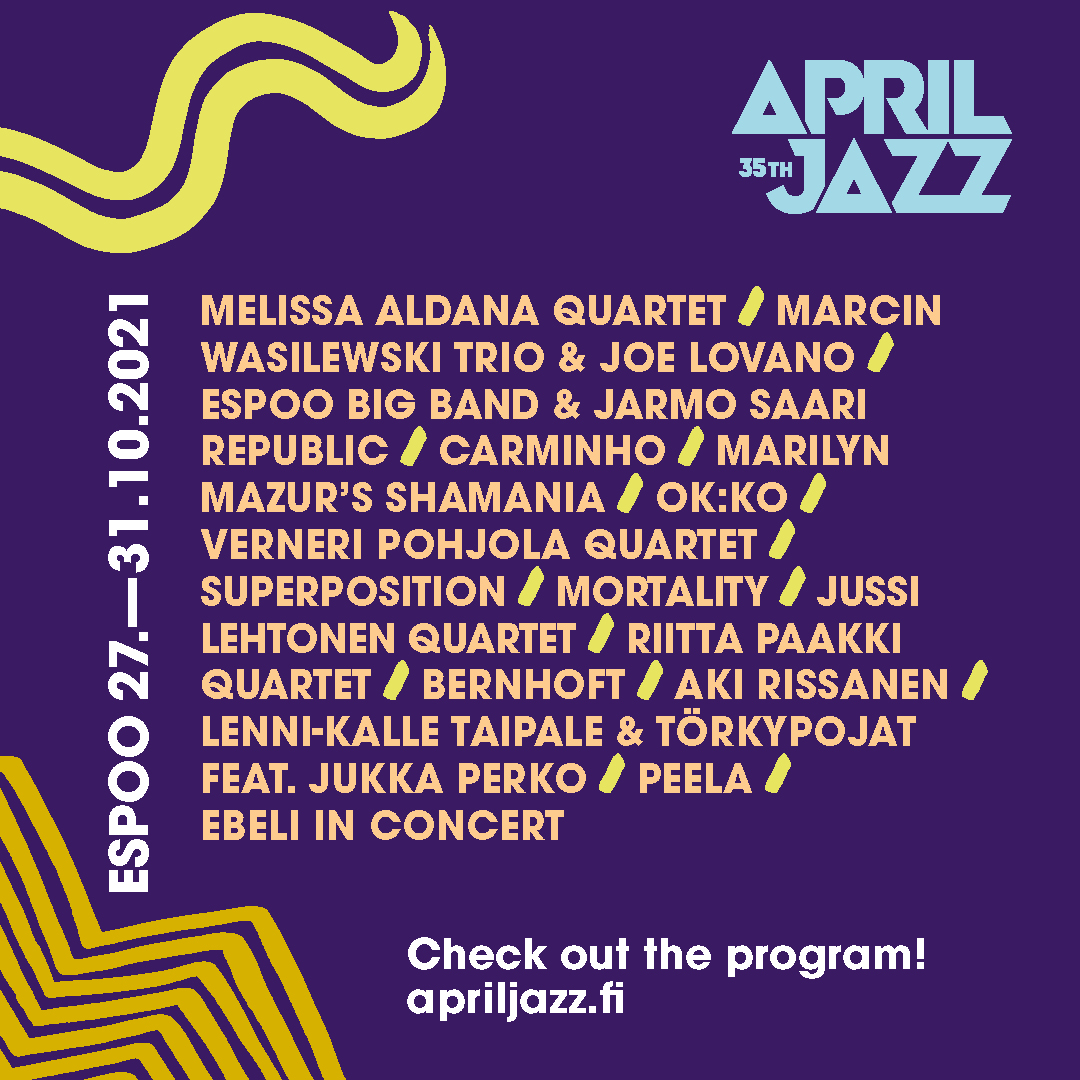 The largest jazz festival in the Helsinki Metropolitan Area will be arranged for the 37th time at in Espoo and Helsinki. The programme features a wide spectrum of Finnish and international jazz & rhythm music stars. As in previous years, April Jazz Espoo will be hosted by the Espoo Big Band.