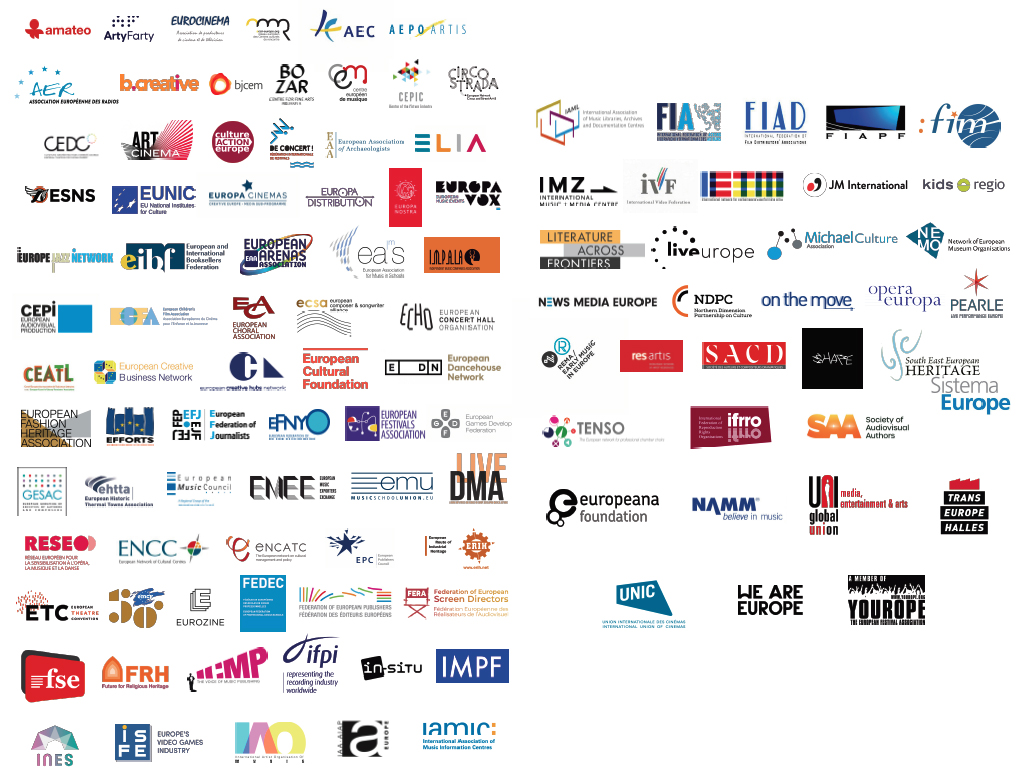 Amateo - Europe’s Network for Active Participation in Culture | Arty Farty | Association de Producteurs de Cinéma et de Télévision (Eurocinema) | Association des Centres Culturels de Rencontre (ACCR) | Association Européenne des Conservatoires, Académies de Musique et Musikhochschulen (AEC) | Association of European Performers’ Organisations (AEPO-ARTIS) | Association of European Radios (AER) | b.creative network | Biennale des Jeunes Créateurs de l'Europe et de la Mediterranée (BJEM) | BOZAR - Centre for Fine Arts | Centre Européen de Musique (CEM) | Centre of the Picture Industry (CEPIC) | Circostrada - European Network for Circus and Street Arts | Coalitions Européennes pour la Diversité Culturelle (CEDC) | Confédération internationale des cinémas d'art et d'essai (CICAE) | Culture Action Europe (CAE) | De Concert! Fédération Internationale de Festivals | European Association of Archaeologists (EAA) | ELIA - globally connected European network of higher arts education | ESNS (Eurosonic Noorderslag) | EU National Institutes for Culture (EUNIC) | Europa Cinemas | Europa Distribution - The European Network of Independent Film Publishers and Distributors | Europa Nostra | Europavox | Europe Jazz Network (EJN) | European and International Booksellers Federation (EIBF) | European Arenas Association (EAA) | European Association for Music in Schools (EAMS) | European Association of Independent Music Companies (IMPALA) | European Audiovisual Production (CEPI) | European Children’s Film Association (ECFA) | European Choral Association - Europa Cantat (ECA-EC) | European Composer & Songwriter Alliance (ECSA) | European Concert Hall Organisation (ECHO) | European Council of Associations of Literary Translators (CEATL) | European Creative Business Network (ECBN) | European Creative Hubs Network (ECHN) | European Cultural Foundation | European Dancehouse Network (EDN) | European Fashion Heritage Association (EFHA) | European Federation of Fortified Sites (EFFORTS) | European Federation of Journalists (EFJ) | European Federation of National Youth Orchestras (EFNYO) | European Festivals Association (EFA) | European Games Developer Federation (EGDF) | European Grouping of Societies of Authors and Composers (GESAC) | European Historic Thermal Towns Association (EHTTA) | European Music Council (EMC) | European Music Exporters Exchange (EMEE) | European Music School Union (EMU) | European network for live music associations (Live DMA) | European Network for Opera and Dance Education (RESEO) | European Network of Cultural Centres (ENCC) | European Network on Cultural Management and Policy (ENCATC) | European Publishers Council (EPC) | European Route of Industrial Heritage (ERIH) | European Theatre Convention (ETC) | European Union of Music Competitions for Youth (EMCY) | Europeana Foundation | Europeana Network Association | Eurozine | Fédération européenne des écoles de cirque professionnelles (FEDEC) | Federation of European Publishers (FEP) | Federation of European Screen Directors (FERA) | Federation of Screenwriters in Europe | Future for Religious Heritage (FRH) | ICMP - The global voice of music publishing | IFPI – representing the recording industry worldwide | IN SITU, European platform for artistic creation in public space | Independent Music Publishers International Forum (IMPF) | Innovation Network of European Showcases (INES) | Interactive Software Federation of Europe (ISFE) | International Artist Organisation of Music (IAO) | International Association of Art (IAA) Europe | International Association of Music Information Centres (IAMIC) | International Association of Music Libraries, Archives and Documentation Centres (IAML) | International Federation of Actors (FIA) | International Federation of Film Distributors’ Associations (FIAD) | International Federation of Film Producers Association (FIAPF) | International Federation of Musicians (FIM) | International Music+Media Centre (IMZ) | International Network for Contemporary Performing Arts (IETM) | International Video Federation (IVF) | Jeunesses Musicales International (JMI) | Kids REGIO | Literature Across Frontiers (LAF) | Liveurope - the live music platform for new European talent | Michael Culture Association (MCA) | National Association of Music Merchants (NAMM) | Network of European Museum Organisations (NEMO) | News Media Europe | Northern Dimension Partnership on Culture (NDCP) | On the Move | Opera Europa | Pearle* - Live Performance Europe | REMA - European Early Music Network | Res Artis - Worldwide Network of Arts Residencies | SHAPE platform | System Europe | Société des Auteurs et Compositeurs Dramatiques (SADC) | South East European (SEE) Heritage Network | The European Network for Professional Chamber Choirs (Tenso) | The International Federation of Reproduction Rights Organisations (IFRRO) | The Society of Audiovisual Authors (SAA) | Trans Europe Halles (TEH) | UNI Global Union - media, entertainment & arts (UNI MEI) | Union Internationale de Cinémas (UNIC) | We are Europe | Yourope - The European Festival Association