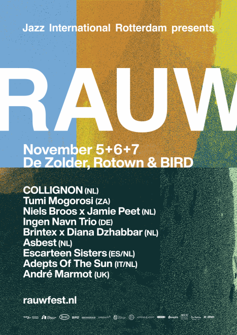 Ranging from spiritual South-African jazz to German experimental punk and from modern cumbia to grooving Dutch electronics: RAUW will raise the temperature and move your body and soul! Here's our full line-up: COLLIGNON (NL) / Tumi Mogorosi (ZA) / Niels Broos x Jamie Peet (NL) / Ingen Navn Trio (DE) / Brintex x Diana Dzhabbar (NL) / Asbest (NL) Escarteen Sisters (ES/NL) / Adepts Of The Sun (IT/NL) / André Marmot (UK).