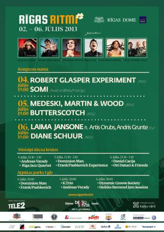 This year the headliners of the festival are – this years Grammy award winner ROBERT GLASPER, beatbox Talent BUTTERSCOTCH, avant-grove trio MEDESKI MARTIN & WOOD, African jazz artist SOMI and jazz legend, Grammy award winner DIANE SCHUUR! Also, the found of last years festival „Rigas Ritmi 2012”, latvian etnographic instrument kokle player Laima Jansone together with latvian jazz artists Artis Orubs and Andris Grunte will present the new album „Zarbugans”. These concerts will be held at the Riga Congress Center: