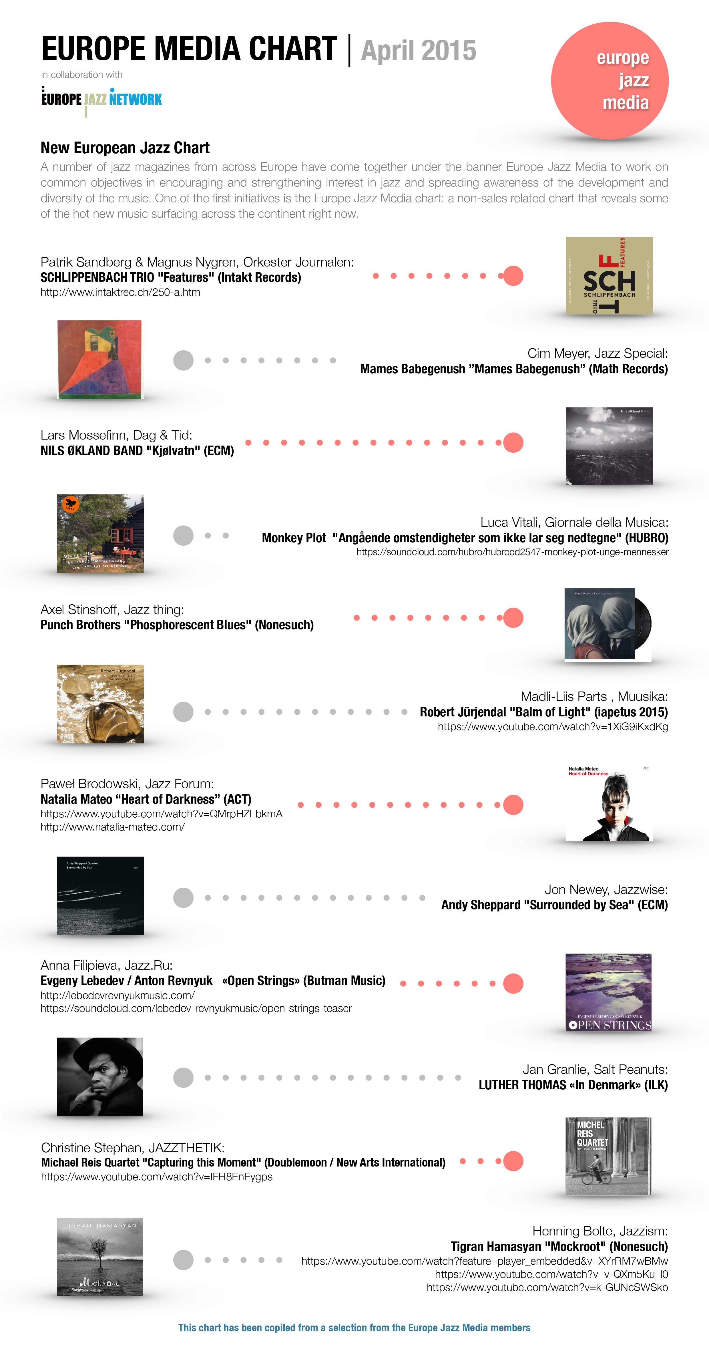 New European Jazz Chart A number of jazz magazines from across Europe have come together under the banner Europe Jazz Media to work on common objectives in encouraging and strengthening interest in jazz and spreading awareness of the development and diversity of the music. One of the first initiatives is the Europe Jazz Media chart: a non-sales related chart that reveals some of the hot new music surfacing across the continent right now.